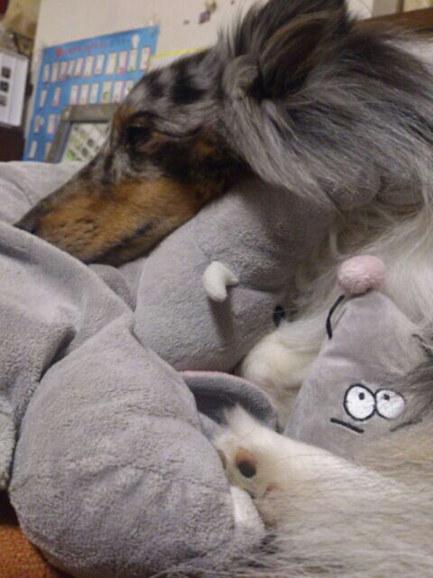 おーちゃんのゾウの枕と、ネズミのクッションを両方使って。