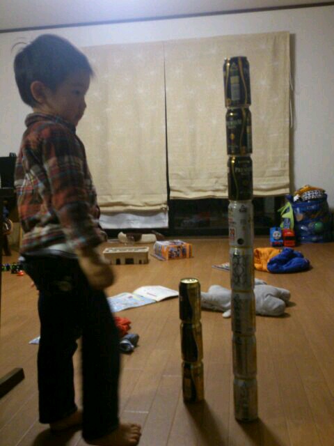 おーちゃんはビールの缶を見ると重ねます。