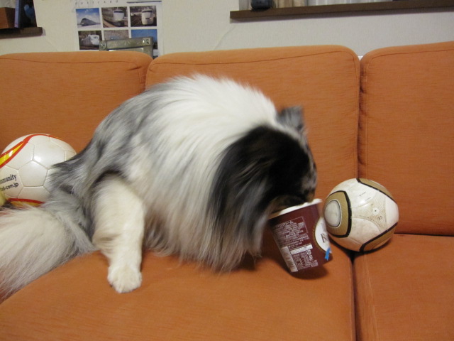 最初、ハウスの中でなめてたけど、私が写真を撮ろうと近づいたら逃げてソファーの上でベロベロ~