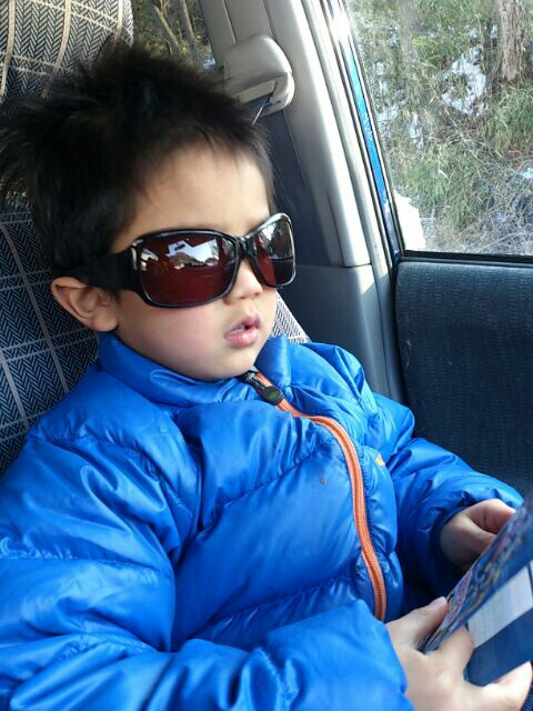 今朝の通園では眩しそうだったので私のサングラスをかけさせたらよく見えたようです。