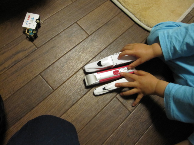 新幹線と新幹線の間に犬のバリカンをはさんで一緒に走らせていたおーちゃん。