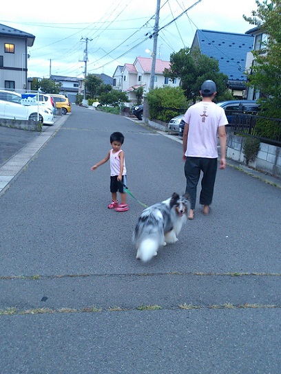 昨日は明るいうちに散歩に行ったので車通りのないときにロイのリードを持たしてみました。