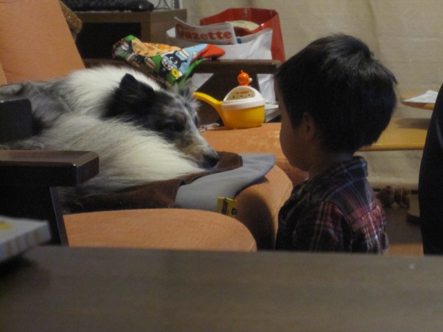 自分のうちの犬に興味のないおーちゃんですが、何を思ったのか初めてロイの顔をジーーーーっと観察していました。