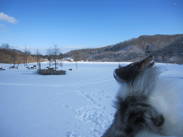 昨日の夜から雪がちょっと降って、積雪2,3センチ?宮床ダムに散歩に行きました。
