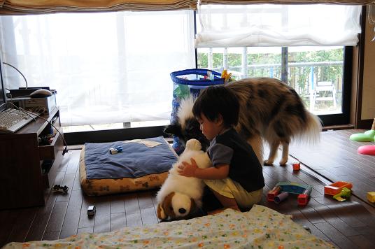 おーちゃんが手にしているのは新しいトラちゃん(コーギーのぬいぐるみ)。