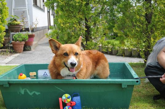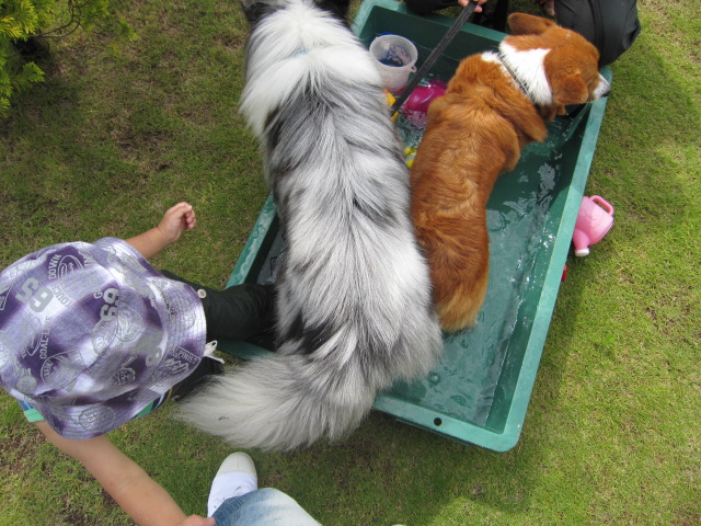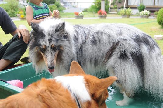 ガンボがすぐ水を飲みつつ入ってきて、結局犬たちのプールに。