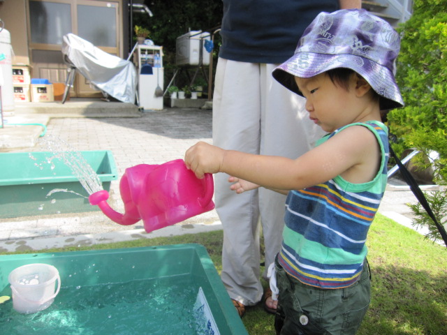 暑いので、庭で水遊び。