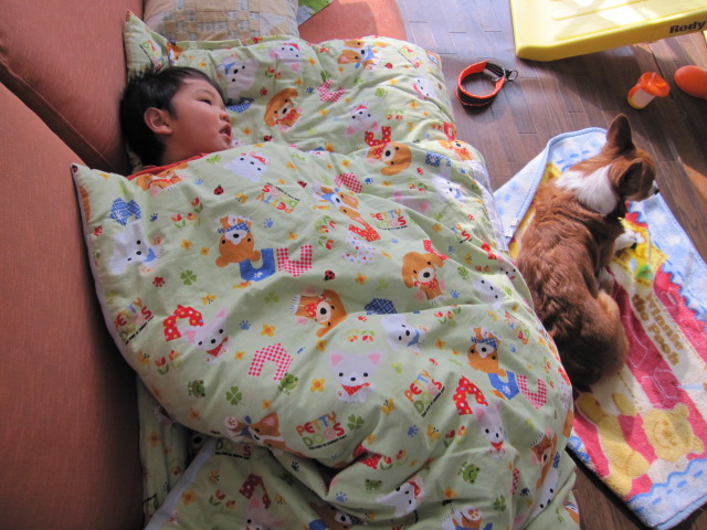 ↓は、またもや保育園の布団でゴロゴロするおーちゃん。