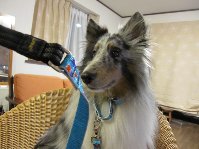 ロイ用には青とシルバーのラメがきれいなチョークの首輪とリード。